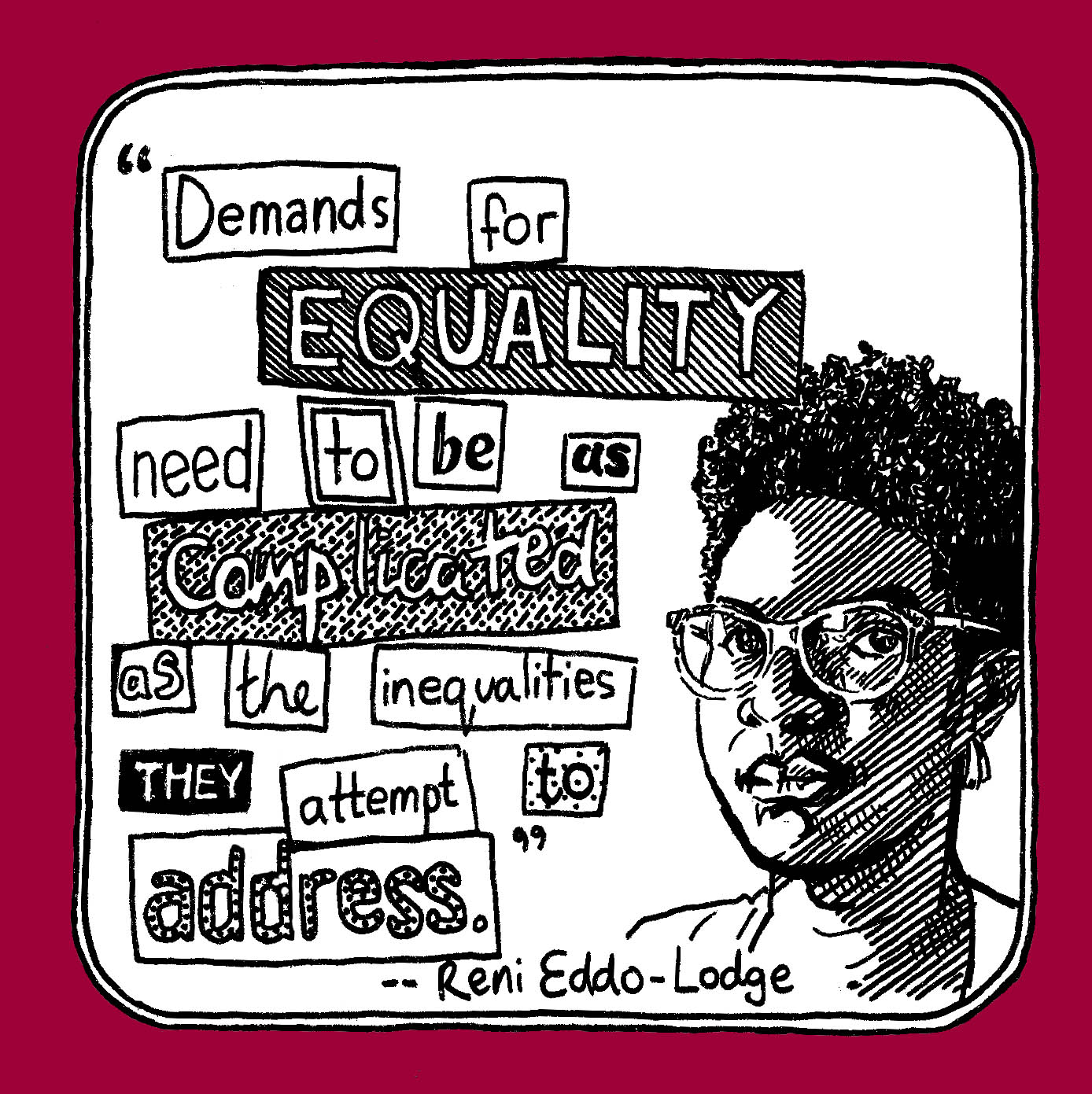 Reni Eddo Lodge quote 03/01/2022 1388 × 1391 Drawn Words Share this: Share on Facebook (Opens in new window) Facebook Share on Pinterest (Opens in new window) Pinterest Share on Reddit (Opens in new window) Reddit Share on WhatsApp (Opens in new window) WhatsApp Share on Bluesky (Opens in new window) Bluesky Like Loading...